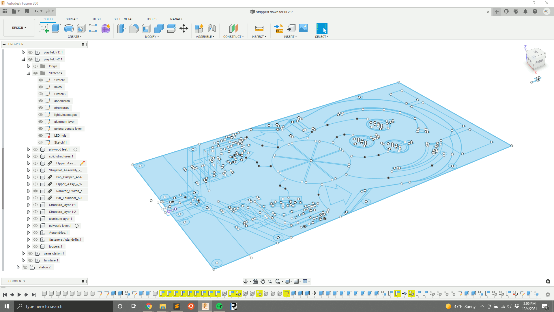 We start with detailed CAD models that include layers of aluminum plate, polycarbonate, and wood and all of the components, fasteners, and wiring.