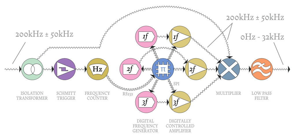stages of analog signals, and SPI, I2C, and RS-232 data lines.