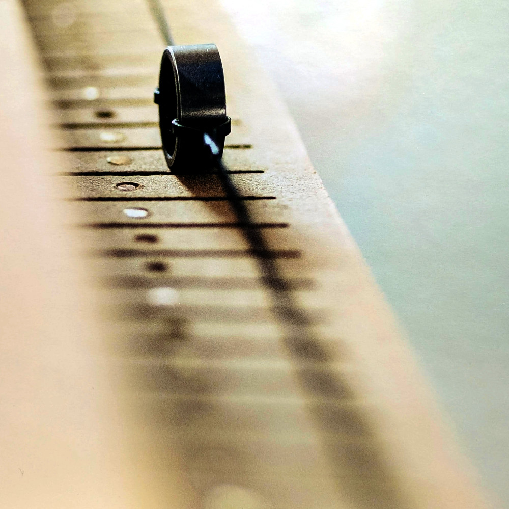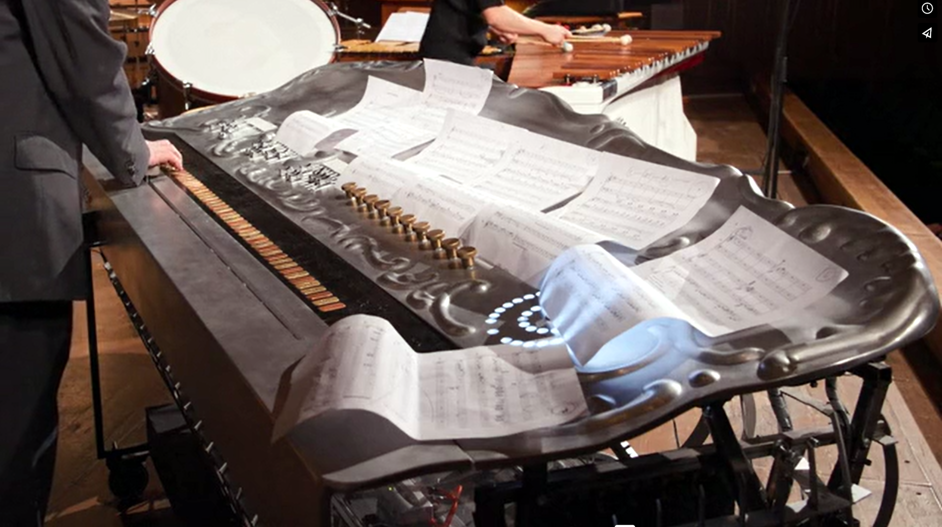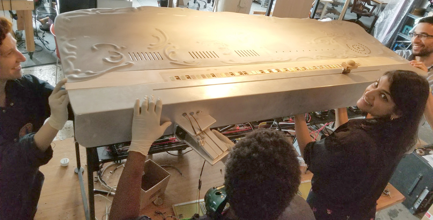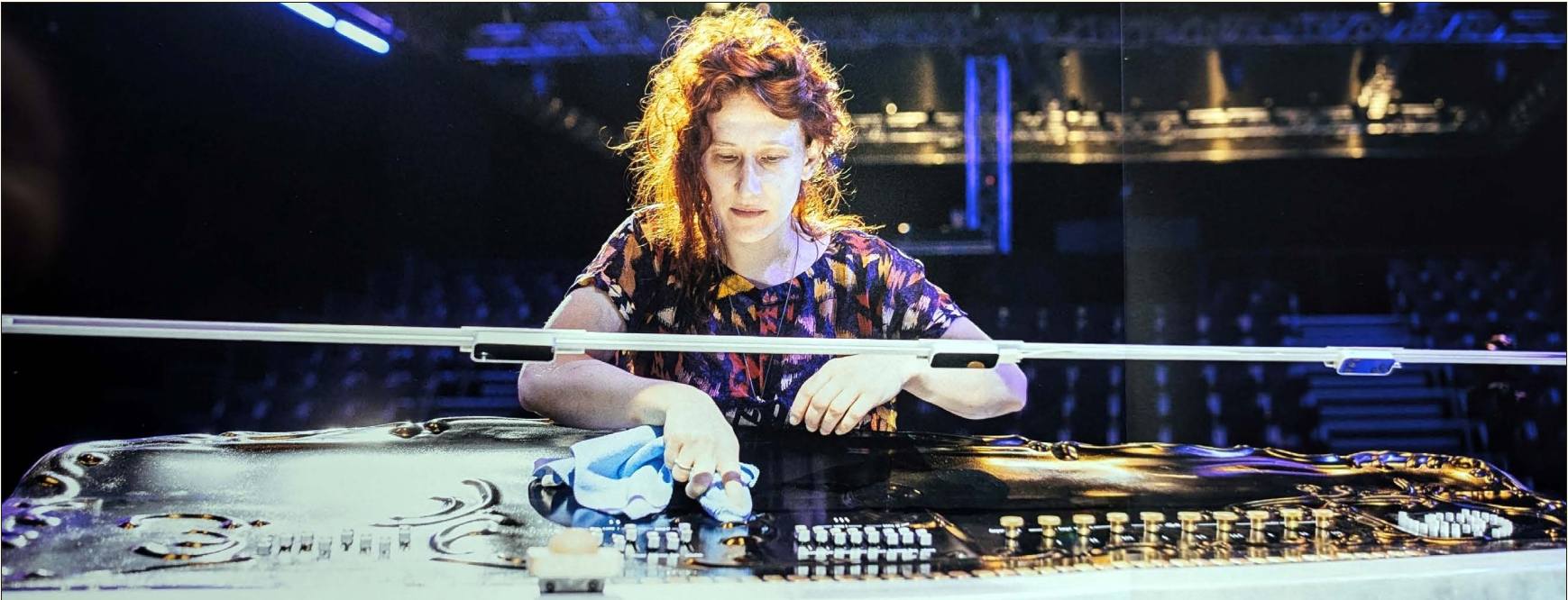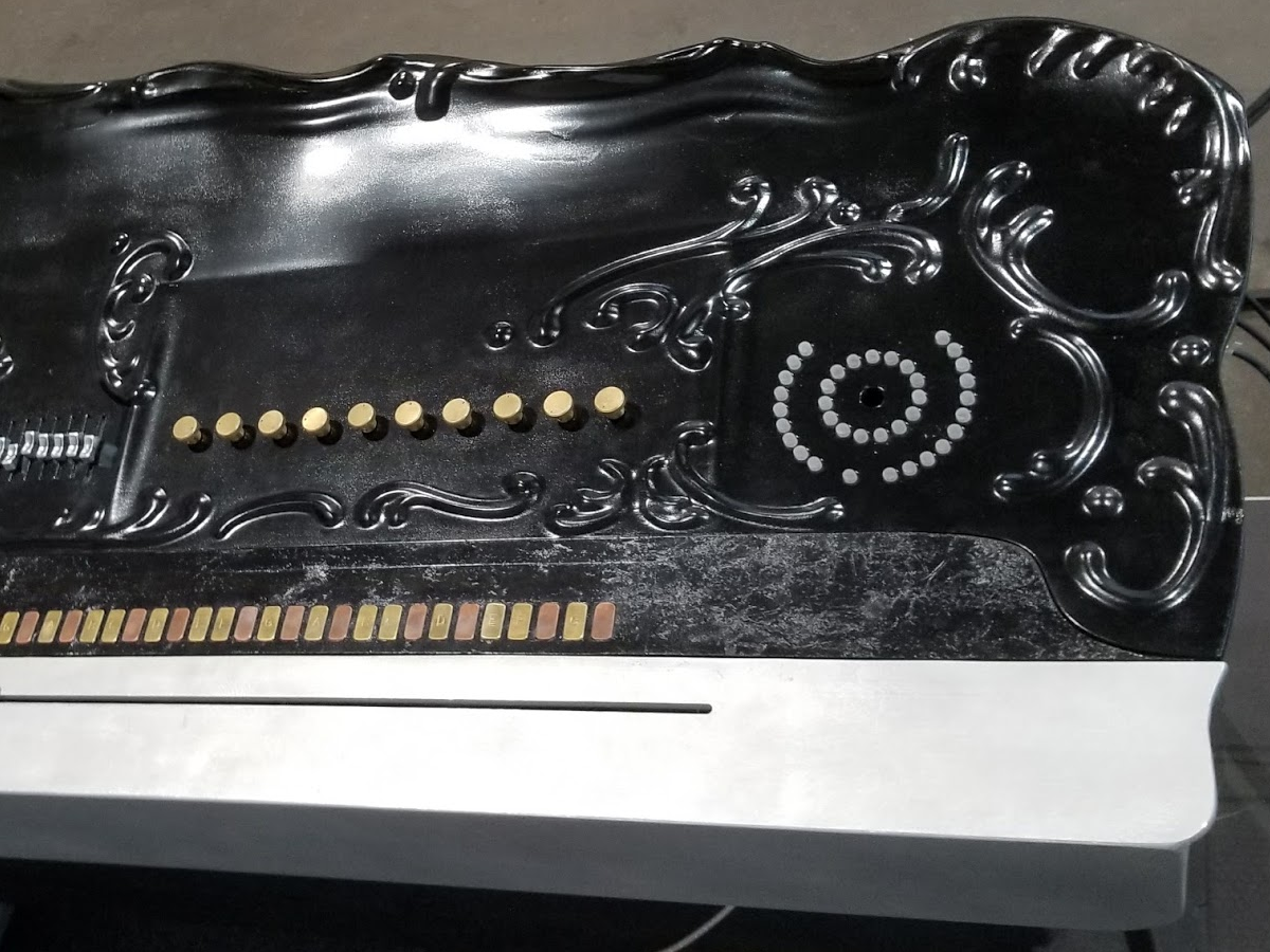 and brass, echoing the black and white keys of a piano keyboard.
