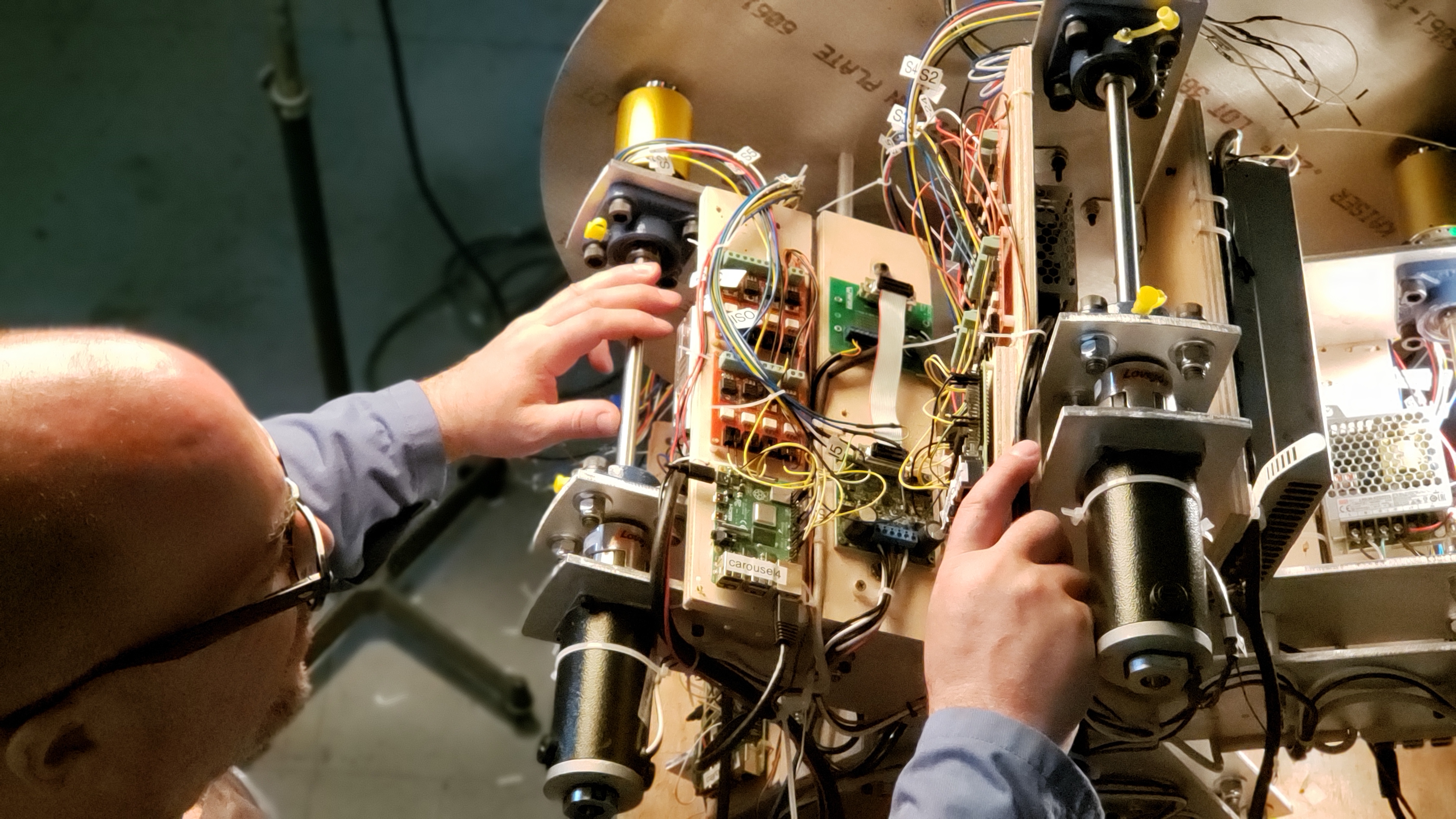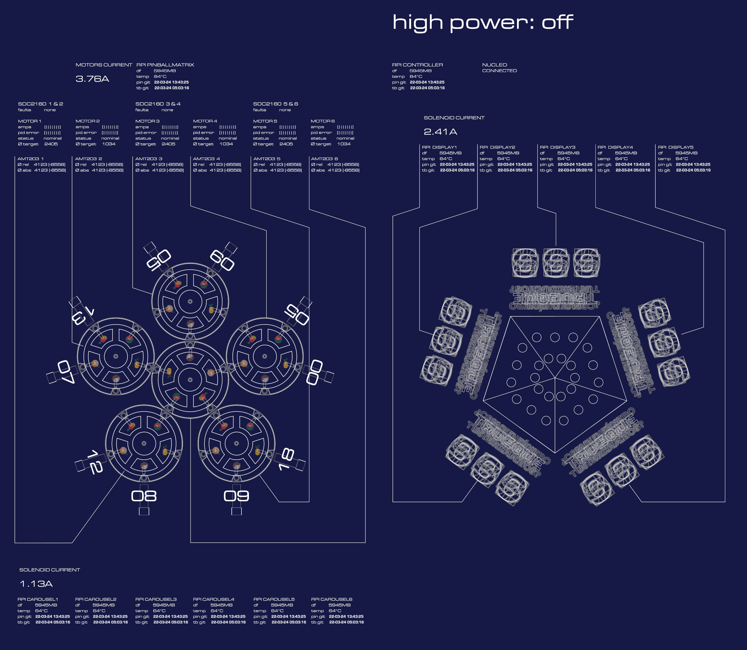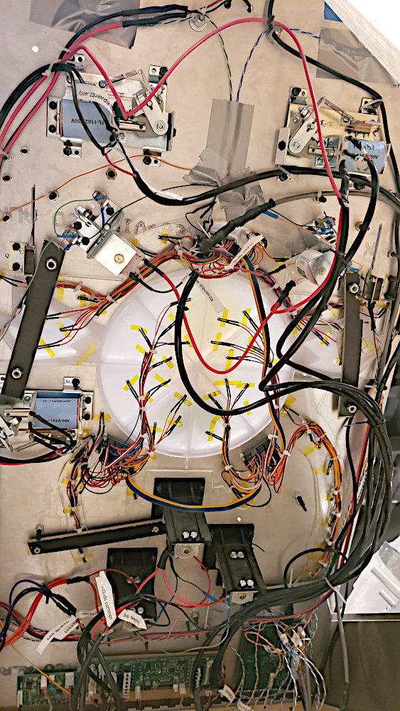 It includes the ten tubes that store and launch balls, the six rotating carousels, their 30 ball-pockets with sensors and solenoids, 144 channels of lighting, and thousands of lines of code distributed on twelve networked computers.