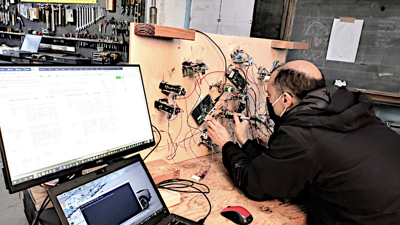 These manage the six servo motors, 10 optical sensors, 12 rotary encoders, 35 inductive sensors, 75 switches, 115 solenoid actuators and 704 channels of lighting.
